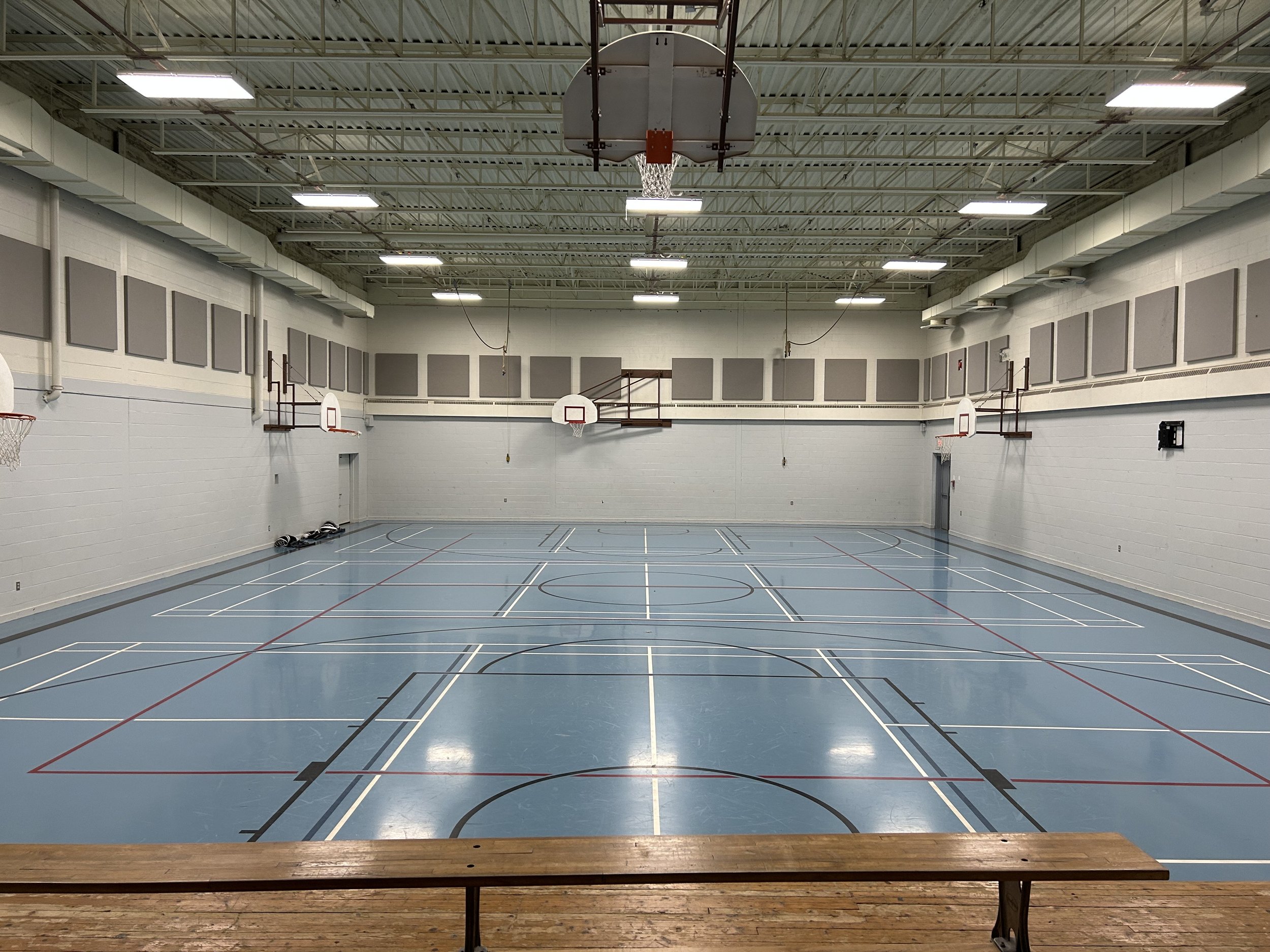 The wood-floored gym measures 55’ by 85’ (4675 square feet) and can be set up for basketball, pickleball, volleyball and other sports and events. Setup and cleanup are included in booking timeframe. Rental fee is $35/hour.